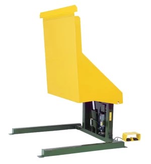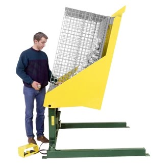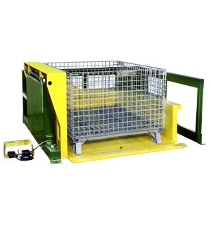 The wide, unobstructed container pan of the E-Z Reach™ Pan-Style Container Tilter allows containers of all types, even those with leg reinforcing bars, to be placed directly on the tilter in a single step by either a fork truck or hand pallet truck. The wide pan even accepts oversized containers.